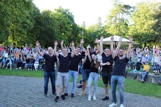 Mit den „FireBeazz“ kam der Sommer zurück und dazu passte wunderbar „Was für eine geile Zeit“ von Ben Zucker. Geschätzt 277 Besucher waren dabei, als der Mega-Hit in dem unverwechselbaren Stil der „FireBeazz“ weithin hörbar durch den Schlosspark hallte. Für Marcel und André Fischer (beide Marimbaphon und Gesang), Christian Edler (Schlagzeug), Jonas Herzberger (Percussion), Lars Ole Ruppel (Xylophon, Glockenspiel), Benedikt Zippel (Kesselpauken) und Sängerin Katrin Bürger war es ein Heimspiel. Trotz der vielen Menschen (am Donnerstag mit einem deutlich niedrigeren Durchschnittsalter als üblich) ging es irgendwie vertraut zu. Man kennt sich eben.