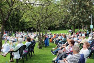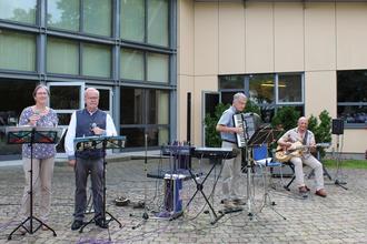 Das „Busecker Quartett“ gehört schon zur „Stammbesetzung“ der Serie „Musik im Park“ und zieht stets viele Besucher an. Nachdem der ursprünglich angesetzte Auftrittstermin am letzten Donnerstag im Juli ins Wasser gefallen war, herrschte am Sonntag allerbestes Open-Air-Wetter. Ein Glück, denn für den diesjährigen Auftritt hat das Quartett besonders viel geprobt. Anlass war die Ausweitung des Repertoires und eine Neubesetzung. Zu Ilona Zacharski und Klaus-Jürgen Grün (beide Gesang), Hartmut Zacharski (Akkordeon) ist als vierter im Bunde Andrej Vinetic (Gitarre) hinzugekommen. Er nimmt den Platz von Norbert Münch ein, der sich nach 33 Jahren aus der Formation zurückgezogen hat und nun ganz entspannt im Publikum sitzend der Musik lauschte.