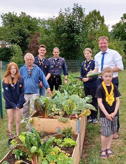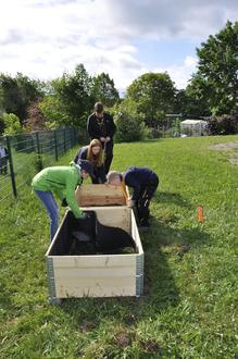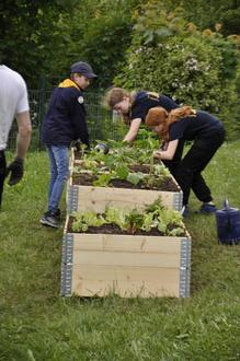 Etwa fünf Quadratmeter Hochbeetfläche hat die Pfadfindergruppe dazu errichtet und eine erste Bepflanzung vorgenommen, die von Reinhold Blumenladen in Großen-Buseck gespendet wurde. Ausgewählt wurden hauptsächlich Obst und Gemüsesorten, von denen auszugehen ist, dass Kinder sie mögen: Erdbeeren, Radieschen, Kohlrabi, Landgurke, Zucchini und Paprika.