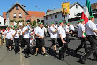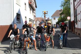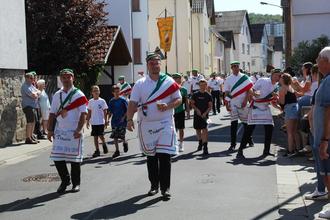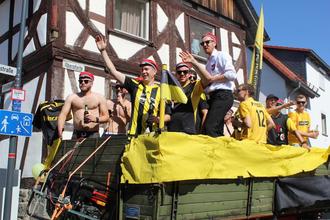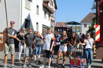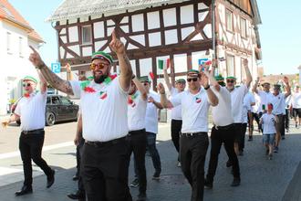 Beim Festumzug zur Großen-Busecker Kirmes spielten sich „Die Kinzebacher“ schon mal für die anschließende Fete mit Tanz im Festzelt ein. Im Takt der Musik marschierten zahlreiche Fußgruppen mit. Angeführt wurden sie von der ausrichtenden Burschenschaft „Teutonia Großen-Buseck“, genannt die Grünen. Auch kleine Füße waren dabei, denn alle drei ortsansässigen Kindertagesstätten waren mit von der Partie. Kirchturmdenken war gestern, beim Feiern stehen die Ortsteile zusammen. So waren etwa die Mofagruppe 49-er aus Oppenrod (Name in Anlehnung an die B 49 und 49 ccm) und die Ale Bousicher Burschen vertreten. Der Skiclub Busecker Tal zog mit einem ausrangierten Lift in luftiger Höhe viel Aufmerksamkeit auf sich. Dass sich am Umzug der Grünen auch die Roten (Burschenschaft Frohsinn) zahlreich beteiligten, ist Ehrensache. Auch wenn die Musiker nicht alle echte Kinzebacher sind, so verstehen sie sich doch ohne Worte, und das bezieht nicht nur auf das musikalische Zusammenspiel. Sängerin Bianca Poloschek kommt aus Alten-Buseck, hatte quasi ein Heimspiel.