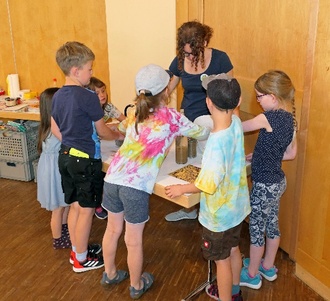 Das tägliche Programm, das von der Jugendpflege Buseck in Zusammenarbeit mit den Sozialarbeiterinnen der Busecker Grundschulen, Hannah Fritz und Elisa Steinmetz, Klimaschutzmanagerin Larissa Hildebrand und weiteren ehrenamtlichen HelferInnen zusammengestellt wurde, bot den Kindern viel Abwechslung. So konnten die Kinder unter anderem bei Experimenten mit TÜV-Kids Experte Manfred Weller Kompost und andere Böden erforschen oder lernten unter der Anleitung von Beate Sieben eine neue Batik-Technik kennen, mit der sie in die Jahre gekommene Kleidungsstücke „aufpeppten“. Am Dienstag besuchte die Gießener Tafel die Gruppe im Kulturzentrum und behandelte den Themenbereich Lebensmittelabfälle und deren Vermeidung auf spielerische und kreative Weise mit den Kindern. Dabei wurde u. a. ein Einkaufsspiel simuliert und die Kinder erfuhren, wieviel Geld Lebensmittel kosten und dass Menschen mit geringem Einkommen oder jene, die Bürgergeld beziehen, sehr sparsam einkaufen müssen. Zum Glück gibt es aber Möglichkeiten für diese, günstiger an Lebensmittel zu kommen, wie z.B. die Gießener Tafel. Ein weiteres Spiel demonstrierte die Bedeutung des Mindesthaltbarkeitsdatums, welches je nach Art des Lebensmittels durchaus noch um Wochen, wenn nicht sogar Monate überschritten werden kann. Das wichtigste ist, seinen Verstand und die Sinne einzuschalten, um abwägen zu können, ob ein Lebensmittel noch genießbar ist.