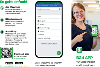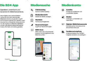 Zusätzlich ist es möglich, sich über die App B24 anzumelden und darüber online auf den Bestand der Bücherei zuzugreifen. Der folgende Flyer („datronicsoft“) erklärt die Vorgehensweise: