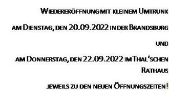 Die Jubiläumsfeier 40 Jahre Bücherei im Thal’schen Rathaus wird auf das Frühjahr 2023 verlegt. Über weitere Einzelheiten werden wir Sie dann rechtzeitig informieren.