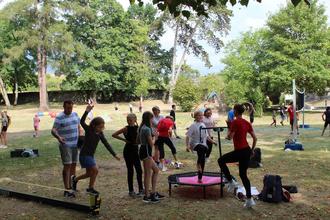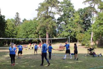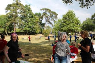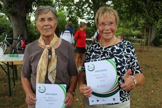 „Bei schlechtem Wetter in …“ stand in der Ankündigung. Gut, dass dies nicht zutraf, denn ansonsten hätte der Turnverein 1899 Großen-Buseck kein dermaßen großes Bewegungsangebot unterbreiten können. Schlosspark und Wetter animierten am Sonntag nicht nur Sportinteressierte, sondern auch Spaziergänger zum Mitmachen. Für Volleyball, Badminton, dem Parkour für Kinder und vielem mehr gab es reichlich Platz auf der Wiese, im Atrium waren Matten für Fall- und Abwehrtechniken der Ju-Jutsu-Abteilung ausgelegt worden. Für die Walkingstrecke boten sich Runden um den Teich an. Beim Einbeinstand mit offenen und geschlossenen Augen, zeigte sich, wer noch im Gleichgewicht ist. Gehirnjogging fand bei Fragen und Antworten während des Ballfangens statt. Wer die vorgegebenen Stationen erfolgreich bewältigt hatte, erhielt das Park-Sport-Abzeichen. Dabei handelt es sich um einen niedrigschwelligen Fitness-Test im Freien. Sportbekleidung war dafür nicht notwendig, so dass auch ein spontanes Mitmachen möglich war. Zumindest bis 16 Uhr hatten dies als älteste Teilnehmer mit 83 und fast 83 Jahren Anneliese Seipp und Herta Stephan geschafft.