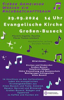| 14.00 Uhr | Gemeinsamer Gottesdienst des neuen Nachbarschaftsraumes „Busecker Tal“ - in der Ev. Kirche in Großen-Buseck |