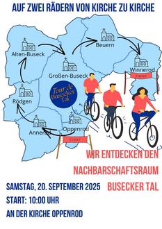 Am Sa., 20.09., wollen wir mit Ihnen den Nachbarschaftsraum Busecker Tal mit dem Fahrrad entdecken. Los geht´s um 10 Uhr an der Kirche in Oppenrod. Es gibt an jeder Kirche des NBR einen kleinen Stopp und einige Infos. Enden werden wir in Winnerod.