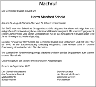 Darüber hinaus war Herr Scheld der Gemeinde Buseck eng verbunden und hat von 1977 bis 1990 in der Bauverwaltung tatkräftig mitgewirkt. Sein Wirken wird in unserer Erinnerung einen bleibenden Platz behalten.