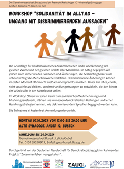 Die Gemeinwesenarbeit Buseck und der Freundeskreis Anger 10 – ehemalige Synagoge Großen-Buseck e.V. laden am 7. Oktober um 17:00 Uhr zum Workshop „Solidarität im Alltag - Umgang mit diskriminierenden Aussagen“ ein.