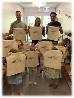 Die beiden Ärzte der örtlichen Hausarztpraxis Remy übergaben der Kita-Leitung im Beisein der anwesenden Kinder mit dem Logo bedruckte Garderobentaschen. Diese Spende erleichtert die täglichen Abläufe, indem sie zu mehr Ordnung beiträgt und stärkt die Identifikation der Kinder mit der Kita.
