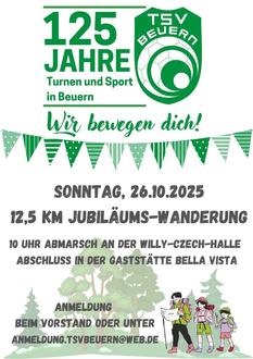 125 Jahre Turnen und Sport in Beuern sollen zum Ende des Jubiläumsjahres auch per Wanderung gewürdigt werden. Da 125 km doch etwas zu lang wären, haben unsere Wanderführer die Strecke einfach auf 12,5 km reduziert. Gemeinsamer Start ist am Sonntag, den 26. Oktober, um 10.00 Uhr an der Willy-Czech-Halle. Zum Abschluss der Wanderung ist eine Einkehr im Restaurant Bella Vista vorgesehen. Um besser planen zu können, bitten wir möglichst um eine Anmeldung beim Vorstand oder per E-Mail an anmeldung.tsvbeuern@web.de.