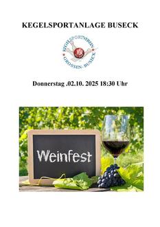 wir laden auch in diesem Jahr wieder herzlich am 02.10.2025 ab 18:30 Uhr in die Kegelsportanlage Buseck ein, um gemeinsam unser inzwischen traditionelles Weinfest zu feiern.