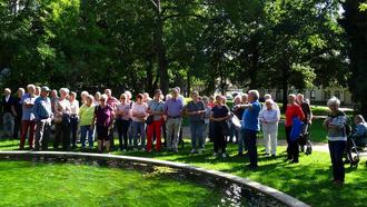 Der Rundgang durch den Schlosspark war ein besonderes Erlebnis. Vorbei an der Schlossremise, die heute von den Spielleuten der Freiwilligen Feuerwehr genutzt wird, ging es in den Park. Dieser präsentiert sich als englischer Landschaftspark mit vielen heimischen aber auch exotischen Bäumen, wie z.B. Platanen, Ahorne, Linden, Eichen, Fichten, Robinien, Buchen, Rosskastanien, Ginkgo, u.a.. Eine besondere Aufmerksamkeit erweckt der Riesen-Mammutbaum, für den ca. sieben Personen notwendig sind, um ihn zu umarmen. Zu den einzelnen Bäumen konnte Erhard Reinl Auskunft über die Entwicklung und die notwendige Pflege geben.