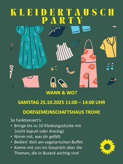 Der Ortsverband der Grünen Buseck lädt am Samstag, den 25. Oktober 2025, herzlich zur Kleidertauschparty ein. Sie findet zwischen 11:00 Uhr und 14:00 Uhr im Großen Saal des Dorfgemeinschaftshauses Trohe statt. Alle Interessierten können bis zu 10 gut erhaltene Kleidungsstücke mitbringen und mit anderen tauschen. Getauscht werden können Kleidungsstücke für alle Altersklassen und Geschlechter. Doch auch wer keine Kleidung abgeben möchte, ist willkommen! Stöbern und mitnehmen ist ausdrücklich erlaubt.