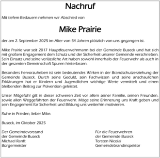 Mike Prairie war seit 2017 Hauptfeuerwehrmann bei der Gemeinde Buseck und hat sich mit großem Engagement dem Schutz und der Sicherheit unserer Gemeinde verschrieben.