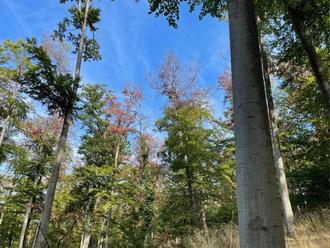 Zu diesem Zeitpunkt bestand noch die Hoffnung auf einen weiteren regenreichen und kühlen Sommer. Dass diese Hoffnung enttäuscht wurde, ist seit den 1,5 Monaten ohne jeglichen Regen Mitte des Jahres klar. Das zeigen uns die Bäume ganz deutlich. Während die Schäden im Laubholz bisher erst im darauffolgenden Sommer (Blattaustrieb) deutlich wurden, sind viele Bäume in diesem Sommer ohne Umwege vertrocknet. Ersichtlich ist das an der tief dunkelbraunen Färbung der Blätter (vertrocknet, siehe Foto). Das hat leider nichts mit einer bunten Herbstfärbung zu tun. Da der Wachstumsprozess durch fehlendes Wasser ganz abrupt unterbrochen wurde, werden die Bäume diese Blätter nicht abwerfen. Auch die „üblichen“ Schadbilder wie abblätternde Rinde, Schleimfluss und Trockenäste im Kronenbereich finden sich am Hohen Berg (Foto 1).