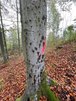 Ein weiteres Schadbild kommt außerdem ganz neu hinzu. Der Buchenborkenkäfer (ähnlich dem Borkenkäfer an der Fichte, jedoch auf Buche spezialisiert) kam bisher nur an umgefallenen liegenden Bäumen vor. Leider sind die stehenden Buchen mittlerweile so sehr geschwächt, dass er sich auch in diese einbohrt und somit absterben lässt (Foto 2).