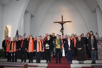 Nachdem der Besinnlichkeit dienend auf Beifall zwischen den Darbietungen verzichtet wurde, kamen zum Konzertende für einen großen Abschlussapplaus alle Mitwirkenden vor dem Altar zusammen. Nach „Freue dich Welt“, einem weiteren Trompetenstück von Johannes Osswald, nahmen die Mitwirkenden und auch etliche Besucher die Einladung zu einem kleinen Umtrunk und „Nachklang“ im Pfarrsaal gerne an.