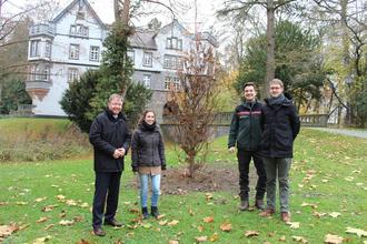 Bürgermeister Michael Ranft, Klimaschutzmanagerin Larissa Hildebrand, Förster Jacob Thomaka und Fabian Zech, Geschäftsführer der Landschaftspflegevereinigung Gießen (v.l.), mit der neu gepflanzten Metasequoia, die noch ein „Urwaldriese“ werden möchte.
