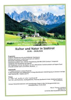 Der Nachbarschaftsraum Busecker Tal plant vom 22.06. bis 28.06.2026 eine gemeinsame Reise nach Südtirol. Freuen Sie sich auf beeindruckende Berglandschaften, Ausflüge nach Bozen und Umgebung, eine Weinprobe und eine geführte Dolomitenrundfahrt.