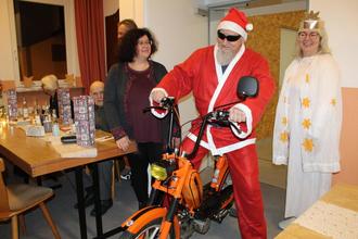 Männer mit grauen Bärten sind in Seniorenkreisen nichts ungewöhnliches, aber mit einem auffälligen roten Mantel und in Begleitung eines Engels schon. Und wenn dann so ein „Nikolaus“ auch noch mit einer Hercules M 5, Baujahr 1980, aus dem Stuhllager kommend in den Saal des Bürgerhauses einfährt, dann ist die Überraschung perfekt. Zu diesem Spaß hatten sich Michael Spuck und seine Ehefrau Bettina Rüster bereiterklärt. Sie gehören dem festen Kreis von 14 Mitgliedern des 2017 gegründeten Mofa-Club „49-ers Oppenrod“ an (Name in Anlehnung an die B 49 und 49 ccm). Zwischen Kaffeetrinken und Abendessen hat Dekanatskantorin Daniela Werner (Staufenberg) mit den Seniorinnen und Senioren gesungen. Ein Heft mit alten Weihnachtsliedern hatte sie dafür ausgeteilt, doch erstaunlich viele konnten die Texte noch auswendig. „So viel gesungen haben wir hier schon lange nicht mehr“, sagte Renate Renger begeistert. Da es offensichtlich allen großen Spaß gemacht hat, bat sie spontan die Dekanatskantorin um eine Wiederholung. „Irgendwann, nicht mehr in 2022“.
