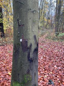 Leider ist im Lohwald weiterhin aufgefallen, dass etliche Bäume mit Äxten und Messern beschädigt worden sind (Vgl. Foto). Dies hat zur Folge, dass einige Bäume nun starke Beschädigungen aufweisen, welche neben Qualitäts- und Vitalitätsverlusten auch zum gänzlichen Absterben führen können.