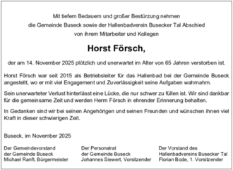 Sein unerwarteter Verlust hinterlässt eine Lücke, die nur schwer zu füllen ist. Wir sind dankbar für die gemeinsame Zeit und werden Herrn Försch in ehrender Erinnerung behalten.