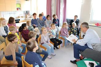 Martin Rößler hat sich bewusst die Kita St. Elisabeth ausgesucht, in die er selbst als Kind gegangen ist. Auch fühlt er sich mit der Kath. Pfarrei St. Marien sehr verbunden, war dort jahrzehntelang Messdiener. Das erzählte er den 17 Vorschulkindern, bevor er den Kindern aus dem Buch „Selmas wundersame Abenteuer im Tapetenwald“ vorlas. Danach entwickelte sich ein angeregtes Gespräch mit den Kindern.