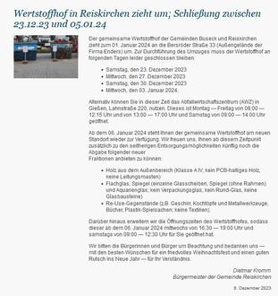 Der gemeinsame Wertstoffhof der Gemeinden Buseck und Reiskirchen zieht zum 01. Januar 2024 an die Bersröder Straße 33 (Außengelände der Firma Enders) um. Zur Durchführung des Umzuges muss der Wertstoffhof an folgenden Tagen leider geschlossen bleiben: