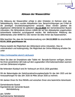 Die Ablesung der Wasserzähler erfolgt in allen Ortsteilen im Rahmen einer sog. Selbstablesung. Hierzu wurden Ablesekarten bzw. Benachrichtigungen per E-Mail an die jeweiligen Grundstückseigentümer versandt. Diese werden gebeten die abgelesenen Zählerstände bis spätestens 31.12.2025 den Gemeindewerken Buseck mitzuteilen. Die Zählerstände können mittels der auf den Ablesekarten angedruckten Antwortkarte kostenfrei zurückgesandt werden. Bei telefonischer Mitteilung des Zählerstandes unter 06408 911-262 nennen Sie bitte immer das Kassenzeichen.
