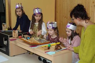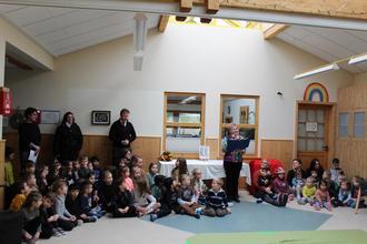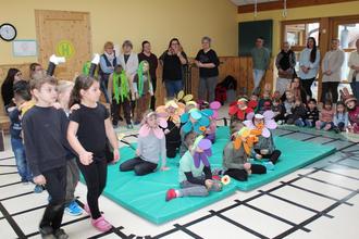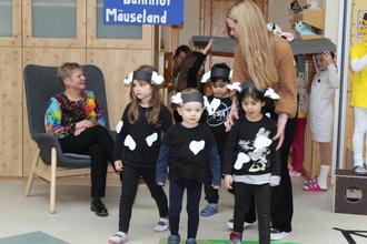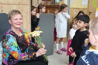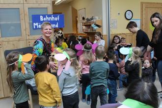 Die „Live-Vorstellung“ der Kinder konnte Gabi Bandt mal nicht mitten drin, sondern in aller Ruhe in einem Sessel verfolgen. Müller-Mehlhos las die Geschichte von „Henriette heißt die nette, alte kleine Bimmelbahn“. Instrumental untermalten einige Kinder das Gesagte, während andere rund um eine Blumenwiese (kostümierte Kinder) mit der fiktiven Bimmelbahn fuhren. Die nach Ankunft am Bahnhof „Mäuseland“ gepflückten echten Blumen wurden Bandt von den Jungen und Mädchen übergeben, die ihrerseits Abschiedsgeschenke entgegennehmen konnten.