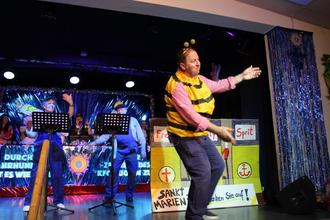 Pfarrer Lukasz Szafera gab gemeinsam mit Ökumene-Pfarrer Bernd Apel und Kita-Leiterin Claudia Sharifi (seit elf Jahren aktiv) als die „Drei von der Tankstelle“ sein Debüt auf der närrischen Bühne des Pfarrsaals. Ein Werbeslogan war schnell gefunden: „Sankt Marien - hier tanken sie auf! Es gab Super Sprit mit Holy Spirit, rein katholischer Kirchen-Sprit, lateinisch "Spiritus Eclesiae", auch bleifrei und mit Weihwasser gestreckt oder vegan, ohne jegliche Anteile von Protestantismus. Szafera selbst tankt 100 Prozent katholisch, nämlich Super. Auch ein kleiner Kanister mit ÖKU-Sprit stand bereit, den es jedoch nur als Sonderedition einmal im Jahr in der ökumenischen Woche gibt. Ein Knaller-Auftritt, der vielen die Lachtränen in die Augen trieb.