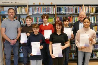Die besten Schülerinnen und Schüler der IGS Busecker Tal konnten von Schulleiter Dieter Maier mit einer Urkunde des Hessischen Kultusministeriums geehrt werden. Auch der Mathematiklehrer und MINT-Koordinator Florian Kupfer gratulierte den Siegern herzlich und wünschte ihnen für die zweite Runde viel Erfolg.