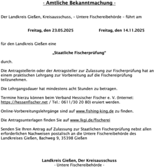 Der Landkreis Gießen, Kreisausschuss, – Untere Fischereibehörde – führt am