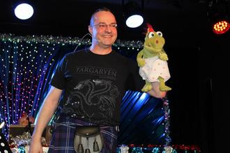 Bauchredner und „künstlerischer Lakai“ Klaus Richardt und sein vorwitziger Baby-Drache berichteten von entgegenkommenden Geisterfahrern und der Himmelspforte, in die nur ganz besondere Todesfälle eingelassen werden.