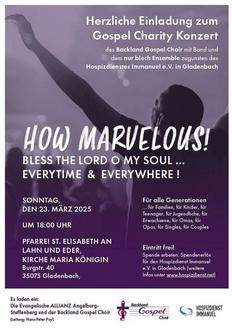 | 18:00 Uhr | Benefizkonzert des Backland Gospel Choir zugunsten des Hospizdienst Immanuel (Maria Königin Gladenbach) |