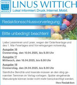 Redaktionsschlussvorverlegung Ostern 2025