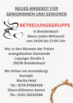 Unsere Betreuungsgruppe richtet sich an ältere Menschen mit Unterstützungsbedarf. In einer warmen, freundlichen Atmosphäre gestalten wir gemeinsame Nachmittage mit Spiel, Gespräch, Bewegung und kleinen Aktivitäten. Ziel ist es, Kontakte zu fördern und pflegende Angehörige zeitweise zu entlasten.
