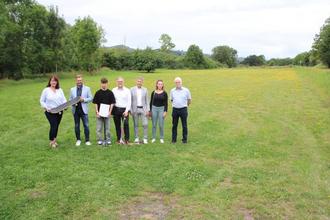 Freuen sich, dass auf dieser Wiese im Gunterstal bis Ende Oktober ein Skatepark entstehen soll: Saskia Kuhl (Lahn-Dill-Bergland), Christoph Felkl, Till Pfister, Jens Womelsdorf, Peter Kremer und Eva Weil (Lahn-Dill-Bergland) und Burkhard Kuhl (Fachdienst Kreisentwicklung).