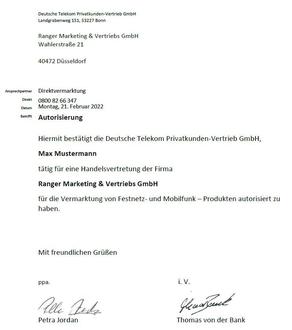 Auf den Ausbau des Netzes folgt zwangsläufig auch der Vertrieb. Um erneute Irritationen bei unseren Bürgerinnen und Bürgern zu vermeiden, informieren wir darüber, dass die Gemeindeverwaltung durch die Deutsche Telekom am 12.09.2023 darüber in Kenntnis gesetzt worden ist, dass bereits ab dem 11.09.2023 autorisierte Vertriebsmitarbeiter im Auftrag der Deutschen Telekom in Breidenbach unterwegs sind, um die Bürgerinnen und Bürger zu besuchen und auf Wunsch zu den modernen Glasfaseranschlüssen zu beraten. Die Kundenberater seien an dem Outfit der Deutschen Telekom zu erkennen und könnten sich mit einem Lichtbildausweis und einem Autorisierungsschreiben ausweisen. Ein Muster eines solchen Autorisierungsschreibens finden Sie in der Abbildung.