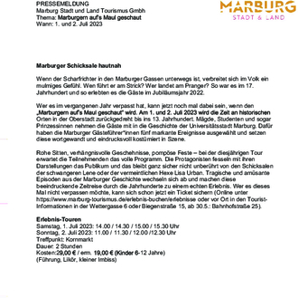 Rohe Sitten, verhängnisvolle Geschehnisse, pompöse Feste - bei der diesjährigen Tour erwartet die Teilnehmenden das volle Programm. Die Protagonisten fesseln mit ihren Darstellungen das Publikum und das bleibt ganz sicher nicht unberührt von den Schicksalen der schwangeren Lene oder der vermeintlichen Hexe Lisa Urban. Tragische und amüsante Episoden aus der Marburger Geschichte wechseln sich ab und machen diese beeindruckende Zeitreise durch die Jahrhunderte zu einem echten Erlebnis. Wer es dieses Mal nicht verpassen möchte, kann sich schon jetzt ein Ticket sichern (Online unter https://www.marburg-tourismus.de/erlebnis-buchen/erlebnisse oder vor Ort in den Tourist-Informationen in der Wettergasse 6 oder Biegenstraße 15, ab 30.5.: Bahnhofstraße 25).