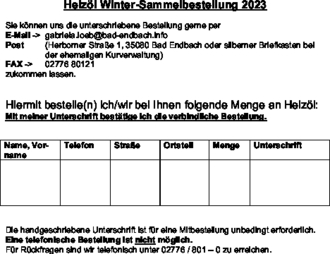 Auch in diesem Jahr bietet die Gemeinde Bad Endbach Ihren Bürger*innen wieder die Möglichkeit an, sich an einer Sammelbestellung für Heizöl zu beteiligen.