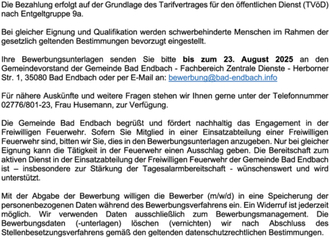 Ihre Bewerbungsunterlagen senden Sie bitte bis zum 23. August 2025 an den Gemeindevorstand der Gemeinde Bad Endbach - Fachbereich Zentrale Dienste - Herborner Str. 1, 35080 Bad Endbach oder per E-Mail an: bewerbung@bad-endbach.info