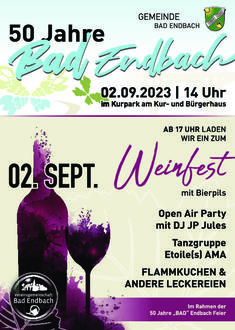 das 50-jährige Jubiläum der Prädikatisierung als Kneipp-Heilbad im Bad Endbacher Kurpark am Kur- und Bürgerhaus. Im Anschluss des Festaktes, welcher um 14 Uhr beginnt, geht die Veranstaltung in das Weinfest der Vereinsgemeinschaft über. Hier wird es Weine des Weingutes Gerhard Wolf aus Rheinhessen, Flammkuchen und Würstchen geben. Nach der Aufführung der Tanzgruppe Etoils(s) AMA versetzt DJ JP Jules den Kurpark dann in Partystimmung. Wir freuen uns auf ein tolles Fest und danken allen Vereinen und Freiwilligen für die Unterstützung.