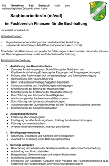 Erforderlich sind Kenntnisse und praktische Erfahrungen im kommunalen Haushalts- Kassen- und Rechnungswesen bzw. in der kaufmännischen Buchführung.