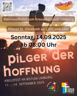 Das Bistum Limburg lädt zum Kreuzfest zur großen Sternwallfahrt nach Limburg ein. Es steht unter dem Motto „Pilger der Hoffnung“ und ist ein Beitrag unserer Diözese zum weltweiten Heiligen Jahr. Mehrere Wallfahrten mit dem Ziel Limburg werden angeboten.