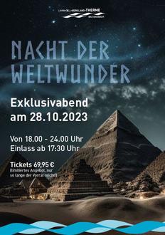 Ein Exklusivabend unter dem Motto „Nacht der Weltwunder.“ - Am Samstag, den 28. Oktober 2023. Im Zeitraum von 18.00 Uhr bis 24.00 Uhr, laden wir Sie ein, die sieben Weltwunder der Antike zu genießen. Es erwarten Sie einzigartige Aufgüsse im stilvoll hergerichteten Ambiente, Köstlichkeiten aus der Gastronomie „ferron“ sowie viele weitere tolle Specials im Thermen- und Saunabereich. Der Badebereich der Therme sowie unsere Totes-Meer-Salzgrotte, stehen Ihnen als unsere Saunanacht-Gäste an diesem Abend ebenfalls exklusiv zur Verfügung. Das Thermen-Team wünscht Ihnen jetzt schon ein unvergessliches Erlebnis und freut sich auf Ihren Besuch!