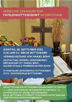| 10.30 Uhr | Familiengottesdienst zum Erntedankfest in der Ev. Kirche in Bottenhorn mit Pfarrerin Katrin Simon, Kindern und Erzieherinnen des Kindergartens, dem Kirchenchor mit Manuel Böhm und Kirchenmusiker Holger Staus |