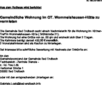 Die Gemeinde Bad Endbach sucht eine/n Nachmieter/in für die Wohnung im Hüttner-Treff in Wommelshausen-Hütte (Brühlstraße 21).
