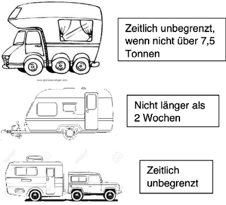 Wohnmobile dürfen grundsätzlich unbegrenzt lange auf öffentlichen Straßen und Parkplätzen abgestellt werden, solange sie zugelassen sind. Aufpassen muss man nur mit einem Wohnmobil, dass mehr als 7,5 Tonnen wiegt. Denn die StVO sieht eine Einschränkung beim Parken vor: Kraftfahrzeuge mit einem zulässigen Gesamtgewicht über 7,5 Tonnen dürfen innerhalb geschlossener Ortschaften in Wohngebieten und Erholungsgebieten in der Zeit von 22:00 Uhr bis 06:00 Uhr sowie an Sonn- und Feiertagen nicht geparkt werden.