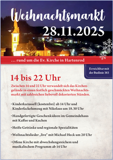 Bad Endbach-Hartenrod, 4. November 2025 - Die Marktkommission der Vereinsgemeinschaft Hartenrod lädt herzlich zum traditionellen Weihnachtsmarkt rund um die Evangelische Kirche in Marktflecken Hartenrod ein.